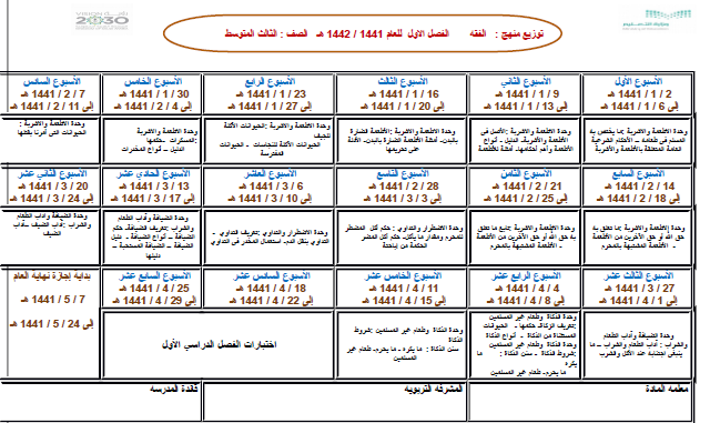 توزيع منهج الفقة الصف الثالث متوسط فترة أولي