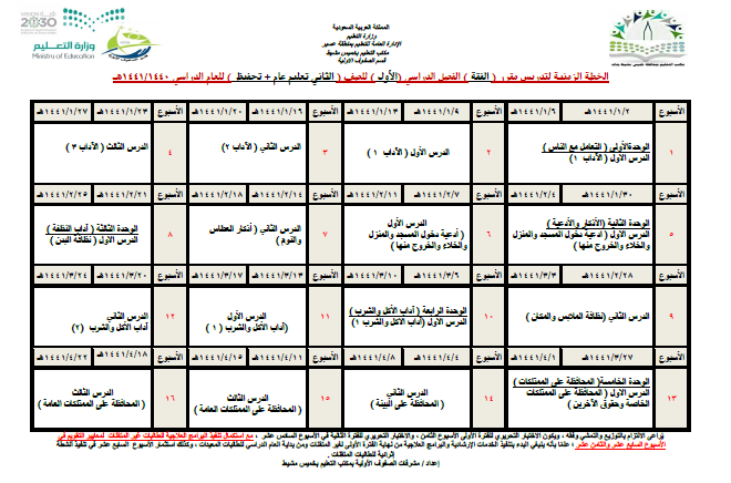 توزيع وتحاضير منهج فقة (1) الصف الثاني الابتدائي فتره اولي