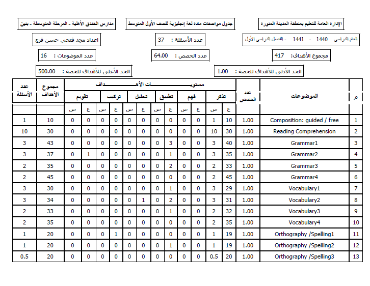 بشكل جديد وشرح مميز مادة جدول مواصفات انجليزي مرحلة متوسط 1