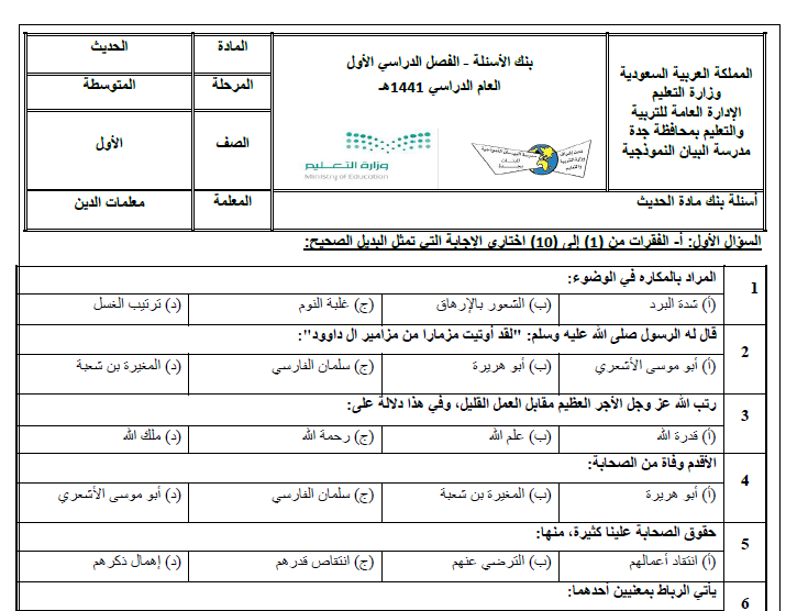 بنك اسئلة حديث ص1م ف1