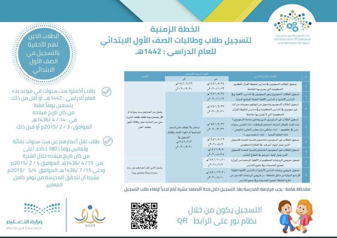 الخطة الزمنية لتسجيل طلاب وطالبات الصف الأول الابتدائي للعام الدراسي 1442 هـ