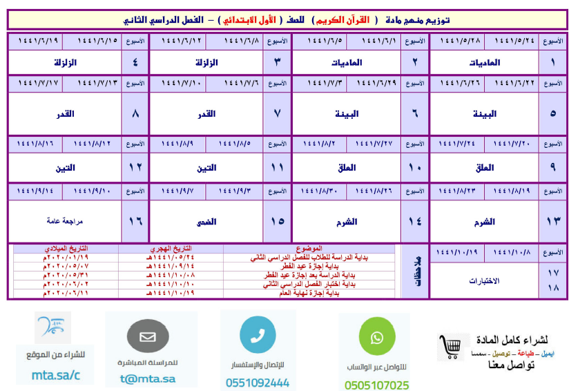 تحميل مباشر توزيع مادة القرآن الكريم الصف ألأول الإبتدائي الفصل الثاني جديد 1